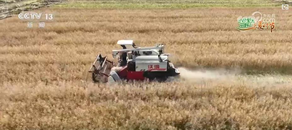 正在夏季轻风的吹拂下,荆州江陵县马家寨乡的油菜田荡起金色的波纹。农机手们驾驶着油菜收割机正在这片金色的海洋中奔驰,熟练地完成收割、脱粒、分手等工序。