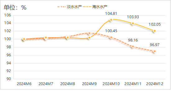 具体产物方面,2024年12月,鲤鱼、鲫鱼、草鱼、南美白对虾和红鳍东方鲀价钱指数别离为96。10点、97。21点、98。62点、100。16点、103。93点,此中鲤鱼、鲫鱼、草鱼、南美白对虾价钱指数较上月小幅下滑。水产具体产物价钱指数走势见下图!