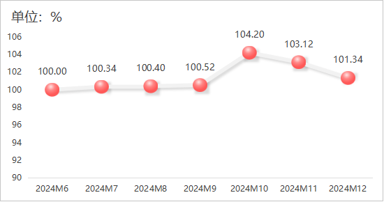 2024年12月,大米产物价钱指数小幅回升,指数值为100。54点,较上月增加0。07个百分点。具体运转环境如下图所示: