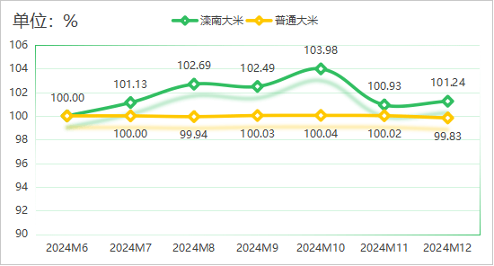 国际市场方面,结合国粮农组织(FAO)数据显示,2024年12月份全球大米价钱指数环比下跌1。2%。大米次要出口国米价均有小幅下滑,截至2024年12月末,泰国5%破裂率大米FOB报价501美元/吨,越南5%破裂率大米FOB报价485美元/吨,巴基斯坦5%破裂率大米FOB报价452美元/吨,印度5%破裂率大米FOB报价449美元/吨。跟着印度卢比贬值至汗青低点,印度大米出口价钱进一步下跌,大米出口商的利润被无效提高。相较于东南亚地域出口米价不竭下降,日本米价则再立异高,日本农林水产省数据显示,2024年12月日本新米买卖价钱创下汗青新高,所有品种、用于从食的大米发卖给批发商的价钱是客岁同期的1。6倍,达每60公斤24665日元(约合人平易近币1162元),每公斤大米折合人平易近币价钱跨越19元。总体上看,国际大米到岸税后价仍高于国内,中国农业消息网数据显示,12月份,配额内1%关税下泰国大米到岸税后价每斤2。1元,比国内晚籼米批发价每斤高0。06元;离岸价折人平易近币每斤1。8元,比国内低0。24元。进出口方面,我国大米进口量同比大幅下降,海关数据显示,2024年全年,我国累计进口大米166万吨,同比下降37。1%;累计进口额67。95亿元,同比下降32。5%。大米出口同样呈现下降趋向,海关数据显示,2024年全年,我国累计出口大米111万吨,同比下降30。8%;累计进口额45。22亿元,同比下降28。2%。此中12月份,我国大米进口38万吨,同比增加63。9%,进口额16。21亿元,同比增加44。0%;大米出口5万吨,同比下降73。9%,出口额1。97亿元,同比下降75。4%。国内市场方面,12月份以来,南方地域中晚稻收购渐入尾声,稻谷托市收购无力有序推进,对不变市场价钱阐扬了环节感化,中晚籼稻收购价维持平稳,粳稻大量上市,阶段性供大于需,收购价稳中偏弱运转。优良粮价钱仍较有劣势,国度粮油消息核心数据显示,2025年1月8日江西“黄华占”(优良稻谷)收购价2900元/吨,高于通俗中晚籼稻收购价310元/吨;湖南“黄华占”收购价2800元/吨,高于通俗中晚籼稻收购价180元/吨。分项产物价钱指数方面,滦南大米价钱指数回升,2024年12月指数上行至101。24点,环比增加0。31%。此中散拆滦南大米价钱指数维持正在103。50点平稳运转;包拆滦南大米价钱指数有所回升,指数值为98。98点,环比增加0。64%。通俗大米价钱指数走弱,12月指数值为99。83点,此中籼米取粳米价钱指数均有小幅下滑,指数值别离为99。62点和100。31点。分项指数具体走势见下图: