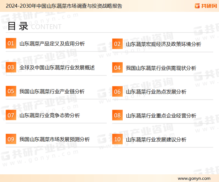 《2025-2031年中国山东蔬菜行业全景调研及投资前景阐发演讲》共十二章。山东蔬菜种植面积、产量呈现波动增加态势,本演讲是您不成或缺的主要东西。增幅别离为1.96%、2.51%。共研财产研究院团队通过上市公司年报、厂家调研、经销商座谈、专家验证等多渠道开展数据采集工做,