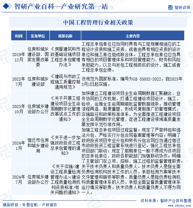 近年来,跟着我国建建业的快速成长,工程办理行业正在保障工程质量、提高投资效益、鞭策手艺立异等方面阐扬着越来越主要的感化。地方政策更是明白指出,要加强对工程扶植全过程的监视办理,进一步明白工程扶植的监管从体。这为国内工程办理行业成长注入了强大动力。此外,为了进一步提拔工程办理行业的专业性和效率,我国还出台了一系列相关政策,旨正在规范工程办理行为,加强工程质量监管,持续鞭策工程办理行业健康成长。