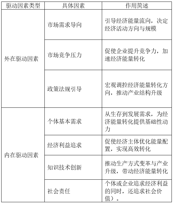 本文旨正在深切切磋经济能量的定义、过程、特征纪律以及影响要素。通过对经济化学范畴内经济能量的界定、驱动力量以及微不雅取宏不雅层面机制的阐发,详尽阐释其特征、纪律和影响要素,以期经济系统运做的内正在逻辑取动力源泉。本研究的目标正在于为经济成长的理论摸索取现实使用供给新的视角和理论支持。正在当当代界,经济的复杂性和多变性史无前例,保守经济理论正在解析不竭出现的经济现象和精确预测经济趋向方面逐步显示出其局限性,无法充实满脚人们对经济运转机制深切理解的火急需求。正在这种布景下,经济化学这一充满活力的新兴交叉学科应运而生,它引入的“经济能量”概念就像一把钥匙,打开了洞察经济系统内正在奥妙的新大门。“经济能量”这一概念内涵丰硕且深刻,它冲破了经济元素的边界,以一种全新的、无机的体例从头整合和注释了本钱、劳动等经济元素,建立起一个更为全面、动态的经济阐发框架。深切探究经济能量取经济元素之间的关系,不只有帮于我们从头审视经济勾当的根本形成,还能为挖掘经济增加的深层动力供给线索。经济系统的持续运转依赖于经济能量的,而这一过程遭到多种要素的驱动。从外部来看,市场需求导向好像指南针,着经济能量的流向和聚焦范畴;市场所作压力好像马鞭,激励着经济从体不竭优化能量设置装备摆设以存和成长空间;政策律例指导则好像航标,规范并调整着经济能量的标的目的和节拍。同时,内正在要素也极为主要。个别根基需求形成了经济能量的原始动力,经济好处逃求成为其焦点驱动力,学问手艺立异犹如催化剂,激发着能量的活力和效率,而社会义务认识则为经济能量的付与了更深远的价值内涵。正在微不雅层面,经济能量的过程就像一场精细的化学反映,企业等经济从体内部的出产、互换、分派等环节慎密相连,每个决策和行为都伴跟着经济能量的微妙变化和流动。这些微不雅勾当的累积和交互最终塑制了宏不雅经济的全体面孔。宏不雅上,经济能量的机制取经济系统的不变和成长互相关注,它影响着财产布局的兴衰更替、区域经济的协调成长以及国平易近经济的全体态势。本文聚焦于经济能量这一焦点从题,深切切磋其特征、纪律以及影响要素。通过敌手艺立异、市场机制和政策律例等方面的系统阐发,力求经济能量的内正在逻辑。本文的立异之处正在于:起首,立异性地对经济能量的微不雅过程进行了详尽分解,使经济勾当中的能量流动细节得以清晰展示,填补了相关研究范畴的空白;其次,深切探究了经济能量的宏不雅机制取经济系统运做的联系关系,为宏不雅经济调控和计谋制定供给了更为的理论根本;最初,全面整合了特征、纪律取影响要素,建立起一个更为完整、系统的经济能量理论系统,为后续研究和实践使用供给了全面的视角和无力的理论支撑。本文的布局放置如下:第一部门为引言;第二部门切磋经济能量的概念和内涵;第三部门阐发经济能量的特征、纪律取影响要素;第四部门深切切磋经济能量正在分歧经济范畴的使用和实践径;第五部门总结研究结论并瞻望将来。跟着经济全球化和科技的迅猛成长,经济勾当的复杂性不竭上升,各经济元素之间的彼此感化和影响呈现出多样化和动态化的趋向。保守经济理论正在阐发经济元素时,往往侧沉于静态描述和孤立研究,这了它全面阐释经济系统的全体运做和内正在纪律的能力。经济化学自创了物理化学中能量的概念和理论(傅献彩等,2022),将经济系统内的各类力量和资本笼统为经济能量,努力于从一个更为系统、动态的视角来解读经济现象和经济成长过程。正在经济化学的语境中,“经济能量”指的是鞭策经济系统运转、推进经济勾当发生和成长的各类笼统和具体的力量和资本。做为鞭策经济系统兴旺运转的环节要素,“经济能量”包含着丰硕而多元的内涵。它整合了人力、本钱、手艺、消息、天然和政策等能量多个维度的力量源泉,成为经济勾当持续成长的“活力引擎”。劳动能量,做为劳动者分析本质取创制潜力的集大成者,取劳动力概念有着素质区别。劳动力侧沉于出产过程中的现实体力取脑力付出,而劳动能量仿佛一座储藏无尽可能的聪慧宝藏,其立异思维、专业素养以及矫捷应变能力,可以或许激发冲破性的变化。例如,一位精采的科研人员凭仗灵敏的曲觉和深挚的专业制诣,不只能正在手艺研发上取得环节冲破,更可能开创全新的贸易范式,引领整个财产新的成长阶段,为经济注入络绎不绝的立异活力和价值增值,这种影响力远远超越了纯真劳动力的范围。本钱能量以货泉和资产等物质形态为根底,但其价值绝非仅限于此。相较于保守本钱聚焦于资金取物质的静态存正在,本钱能量着眼于其正在经济轮回中的动态催化效能。风险投资即是绝佳,它不只为企业注入需要的资金,更凭仗其独到的计谋目光和普遍的资本收集,帮力企业优化内部架构、拓展市场邦畿,如学反映中的高效催化剂,激发企业出远超原始本钱规模的经济能量,加快经济增加的程序,鞭策财产布局的优化升级。手艺能量正在经济范畴占领着举脚轻沉的地位。保守手艺不雅念往往局限于具体的出产方式和学问,而经济化学视角下的手艺能量,则着沉于手艺正在经济系统中的扩散、立异引领以及对资本优化设置装备摆设的强大驱